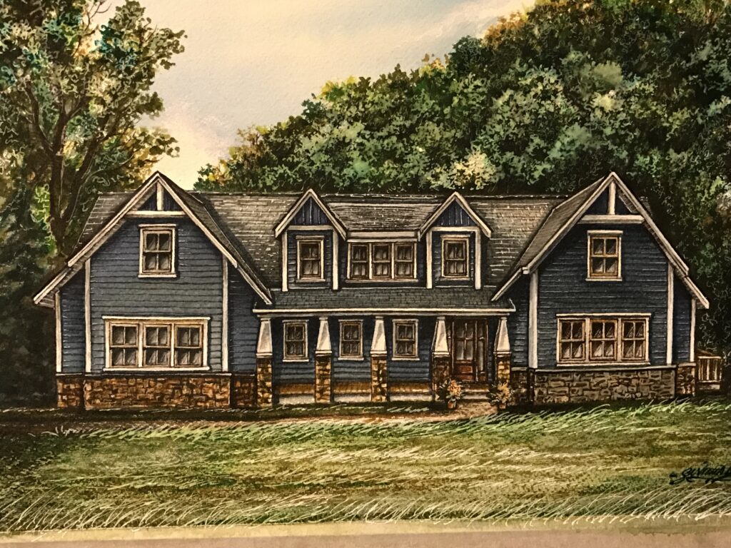 - Exterior perspectives, painted from plans, renderings, or reference photos
